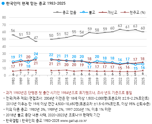 <한국갤럽>이 26일 발표한 ‘한국인의 종교 1983-2025’ 조사에 따르면, 2025년 기준 종교를 믿는 성인은 40%로 집계됐다. 이는 2022년 37%에서 증가한 수치로, 코로나19 팬데믹 이후 처음 나타난 반등이다.