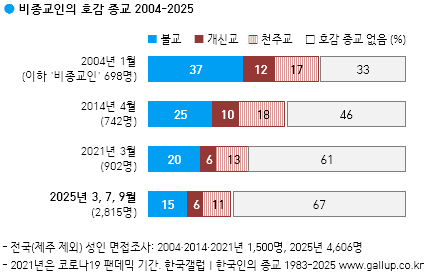 그러나 그보다 더 중요한 지표는 ‘호감 종교 없음’이다. 이 응답은 2004년 33%에서 2025년 67%로, 20년 사이 두 배로 증가했다. 이는 특정 종교에 대한 호불호 이전에, 종교 자체가 삶의 관심 영역에서 멀어지고 있음을 보여준다.