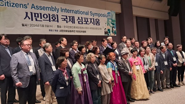 ▲ 2024년 5월 서울에서 열린 시민의회 국제심포지움에서 시민의회입법추진100인위원들이 선언하고 있다. ⓒ 이원영시민의회는 전국 유권자 명부에서 무작위 추첨으로 선발한 150~200명으로 구성하되, 성별·연령·지역·직업·교육수준 등의 비례를 맞추어 '대한민국의 축소판'이 되도록 설계한다. 임기는 안건별로 3~6개월로 한정하고, 참여 기간의 활동비(일 15~20만 원 수준)와 직장·학업 보호(휴가 의무 인정, 복귀 보장)는 국가가 보장한다.